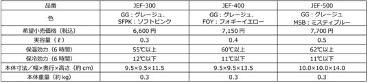 『真空断熱スープジャー(JEF-300/400/500)』 仕様一覧