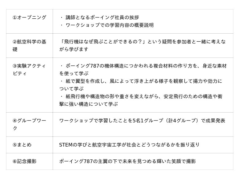 次世代を担う若い世代の育成を目的に、ボーイングが推進する科学(Science)、技術(Technokogy)、工学(Engineering)、数学(Mathematics)の教育支援プログラム「STEM プログラム」の一環として実施し、座学ではなく、ボーイング社員との英語を交えたコミュニケーションを取り入れ、子どもたちが仲間とともに考え、発表するという体験型の教育を、ボーイング787 初号機という実物の飛行機のもとで体験していただくことで、子どもたちに航空と工学の魅力を伝えます。