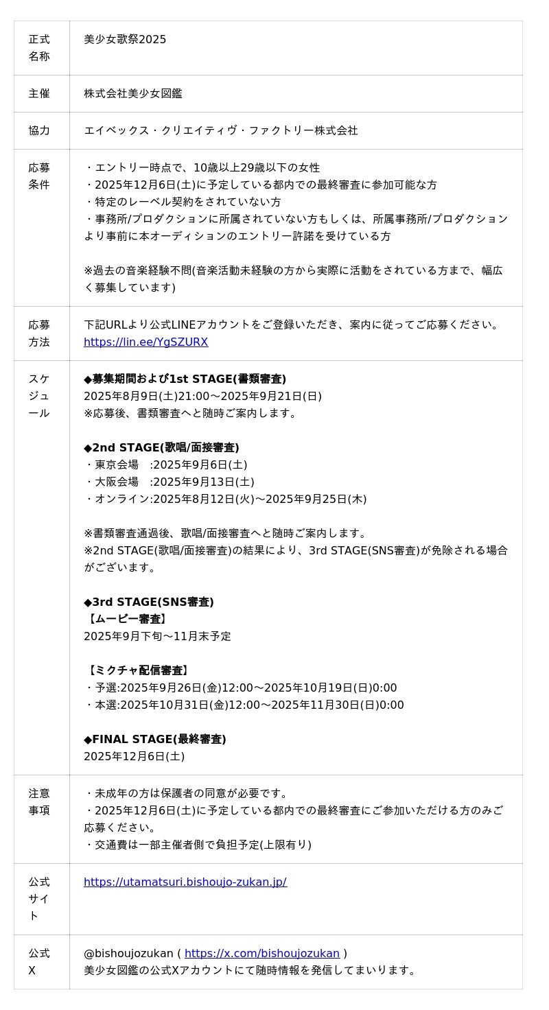 株式会社美少女図鑑(東京都渋谷区、代表取締役:中村孔亮)が運営する地域密着型メディア『美少女図鑑』は、音楽経験不問の次世代女性シンガー発掘オーディション「美少女歌祭2025」の開催を決定しました。現在、本オーディションへのエントリーを受付中です。【募集期間:2025年8月9日(土)21:00~9月21日(日)】