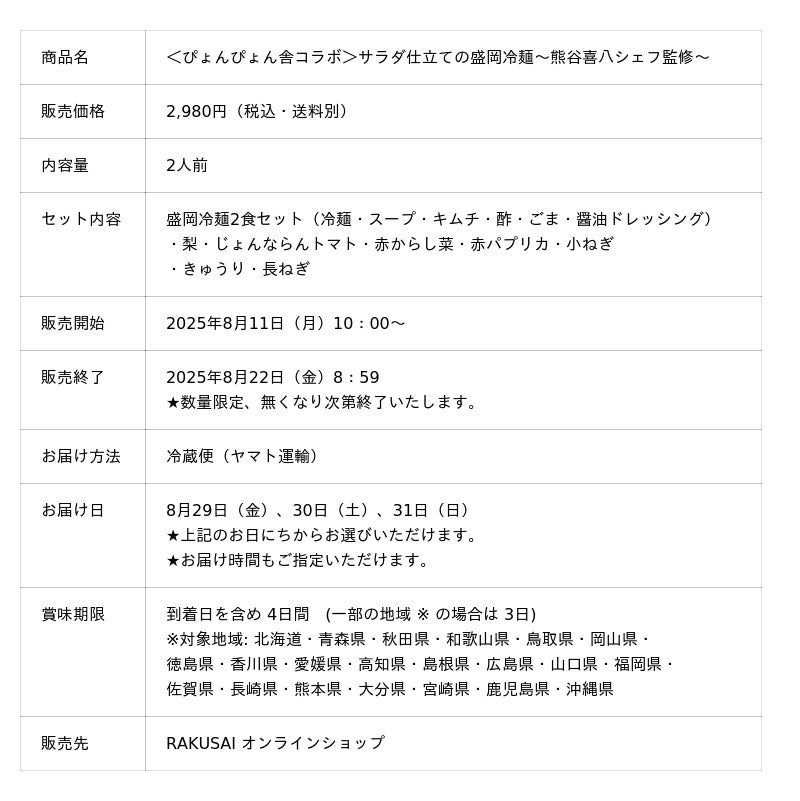 楽彩株式会社(本社:東京都足立区/代表取締役社長:大崎善保)は、盛岡冷麺の老舗「ぴょんぴょん舎」とコラボレーションし、熊谷喜八シェフ監修のもと開発した『サラダ仕立ての盛岡冷麺セット』を、2025年8月11日(月)10:00より公式オンラインショップにて、期間限定で販売開始いたしました。