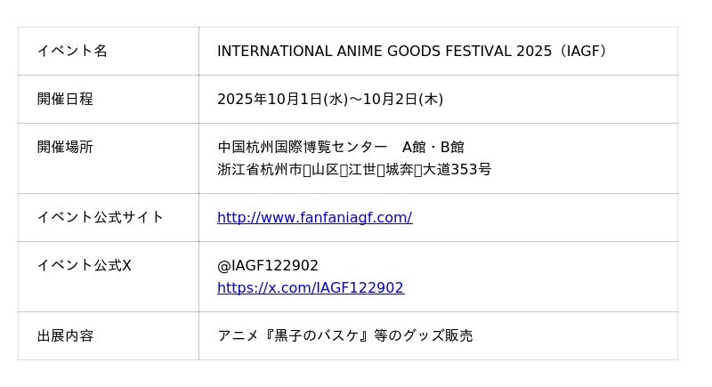 キャラクターグッズの商品企画・製作・販売を行う中外鉱業株式会社コンテンツ部は、中国・杭州で開催されるアニメグッズの展示・販売イベント「INTERNATIONAL ANIME GOODS FESTIVAL 2025(IAGF)」に出展いたします。会場では日本の人気コンテンツのグッズ販売を予定しております。