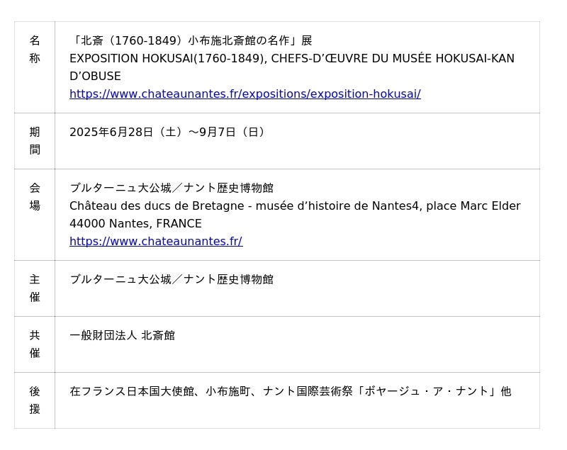 「北斎(1760-1849)小布施北斎館の名作」展は、毎年夏に100万人以上が訪れる文化芸術の街 ナント市の観光キャンペーン「ボヤージュ・ア・ナント(Le Voyage a Nantes)」の目玉企画として開催されている展覧会です。会場となるブルターニュ大公城/ナント歴史博物館はフランス国内でも有数の美術館として知られており、今年も20万人以上の集客が見込まれています。本展覧会では、長野県小布施町にある一般財団法人 北斎館※2の全面協力のもと、「水と波」などをテーマにした葛飾北斎の作品160点以上が展示され、多くの来場者を魅了しています。