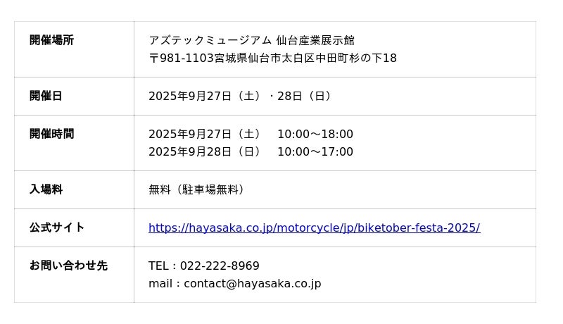 オートバイ・自転車を販売および修理する「ハヤサカサイクル」を運営する株式会社早坂サイクル商会(本社:宮城県仙台市、代表取締役:早坂 武)は宮城県仙台市太白区にあるイベントホール アズテックミュージアムにて、国産4メーカー、ハーレーダビッドソン、海外ブランド、各メーカー専売店モデルやEV(電動)バイクなど世界のあらゆるモーターサイクルが集結するバイクの祭典を開催。東北最大級のバイクイベント「BIKETOBER FESTA(バイクトーバーフェスタ)」を2025年9月27日(土)、28日(日)に開催いたします。