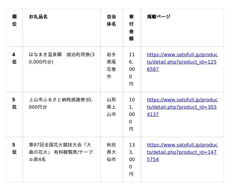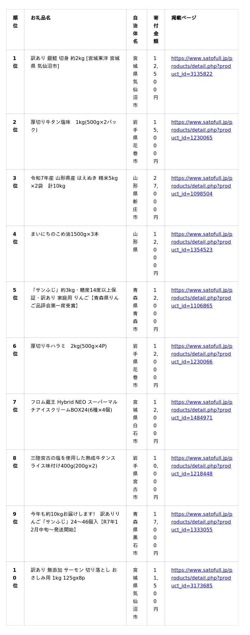 ふるさと納税ポータルサイト「さとふる」を運営する株式会社さとふる(本社:東京都中央区、代表取締役社長 兼 CEO:藤井 宏明)は、「さとふる」の2025年上半期における<東北版>ふるさと納税人気お礼品ランキング、および<東北版>「体験・お出かけ」人気お礼品ランキングを発表します。