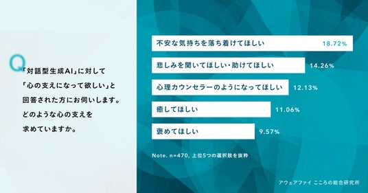 - - 気軽に相談できる相手として、最も回答が多かったのは「対話型AI」で、2位の「親友」と比べても30ポイント以上の差があることが明らかになりました。