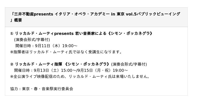 三井不動産は、「東京・春・音楽祭」(※)が主催する「リッカルド・ムーティ イタリア・オペラ・アカデミー in東京vol.5」に特別協賛しており、本イベントでは東京ミッドタウン日比谷にて、「イタリア・オペラ・アカデミー」で演奏されるムーティ氏と若き音楽家によるヴェルディの《シモン・ボッカネグラ》のパブリックビューイングを開催いたします。また、日生劇場、藤原歌劇団によるオペラコンサートや、才能豊かなヴァイオリニスト、ピアニストら多彩なアーティストによる演奏をお送りします。