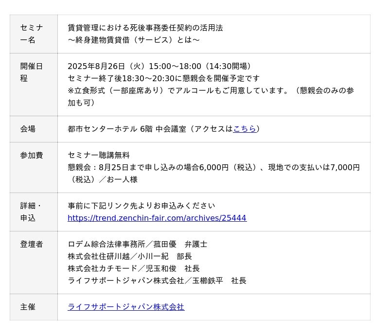 公益財団法人さいたま市産業創造財団(埼玉県さいたま市、理事長:中村雅範)が実施するスタートアップ支援事業「さいたま市アクセラレータープログラム(SCAP)」採択者のライフサポートジャパン株式会社(埼玉県さいたま市、代表取締役:玉櫛鉄平)は、8月26日(火)開催の賃貸管理・改正住宅セーフティーネット制度に関する特別セミナーにおいて、"はたらくパパ・ママ応援プロジェクト"を新たに実施します。