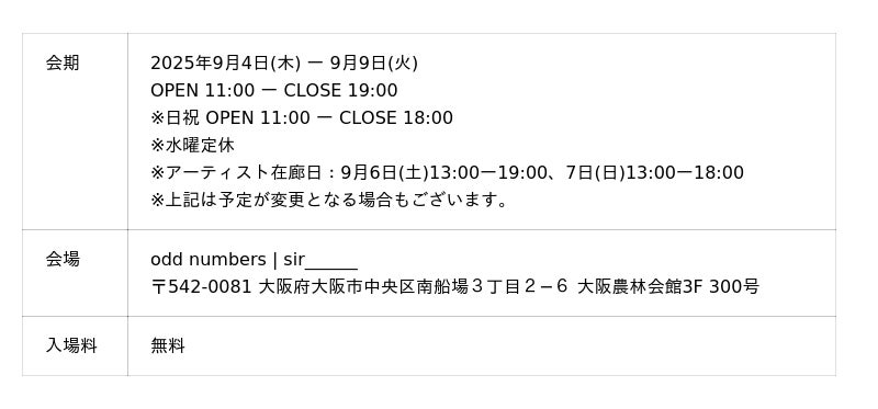 会場となる「odd numbers | sir______」は、登録有形文化財にも指定されている大阪農林会館の3階に位置し、歴史ある建築の趣とともに、南船場という街の空気感と調和しながら、静かに感性を刺激する場を提供しています。ジャンルを超えた独自の世界観を展開する「odd numbers」と「sir」、2つの異なる特性が織りなす空間にて、山崎円城氏による作品を展示いたします。