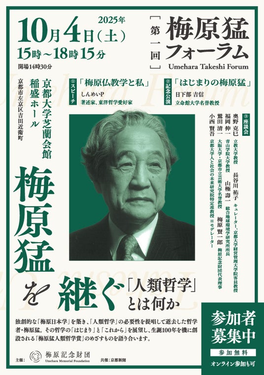 名 称 :第一回梅原猛フォーラム「梅原猛を継ぐ~『人類哲学』とは何か」日 時 :2025年10月4日(土) 午後3時~午後6時15分(同2時30分開場)