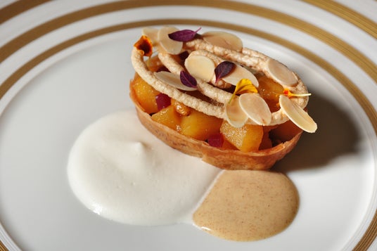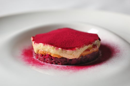 シナモンが香る、2層仕立ての生地を土台に、甘酸っぱく煮詰めたりんごのコンポートやビーツ、香ばしいナッツやアーモンドメレンゲを重ねています。一般的なシュトゥルーデル(*5)は薄い生地で具材を巻き込んで焼き上げますが、今回は素材の風味や食感をより引き立てるため、それぞれの食材を重ねる構成に仕立てました。仕上げのソースは、まろやかな牛乳とコクのあるヘーゼルナッツの2種類。豊かな香りとやさしい甘さが、秋の余韻を締めくくります。
