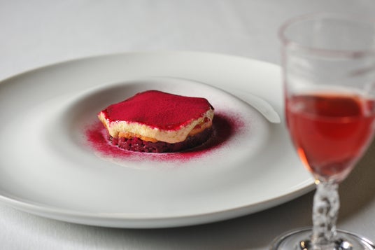 メインの鹿肉は、熟成香や旨味が強く、柔らかいのが特徴です。長時間かけてじっくりと水分を飛ばし、旨みを凝縮させた葡萄のアローストとともに仕上げました。鹿肉の骨や肉から抽出した旨みを凝縮したソースに、マニゲット(*4)の香りや根セロリのチップがアクセントとなり、鹿肉の力強い旨味と葡萄の甘みを繊細に引き立てます。秋を感じさせる豊かな味わいの重なりを堪能できる一皿です。