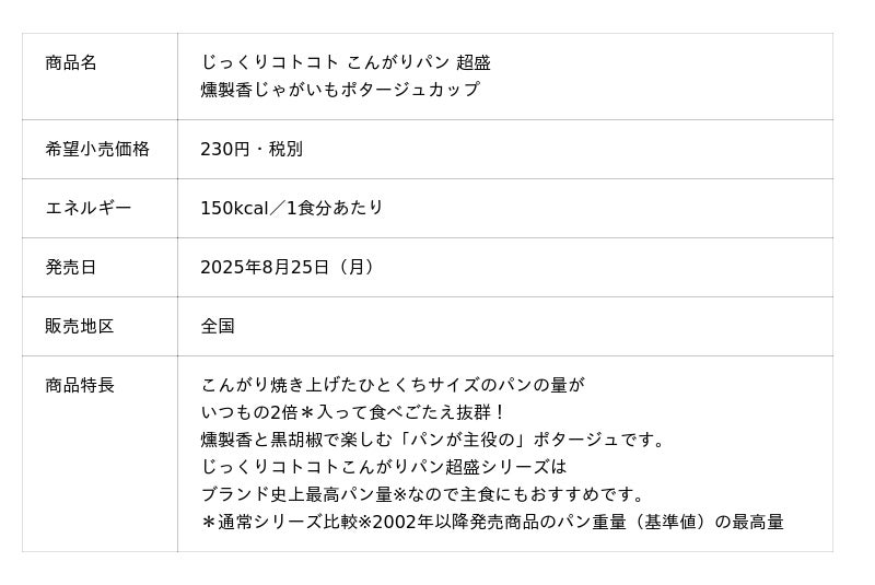 サッポロホールディングス(株)のグループ企業である、ポッカサッポロフード&ビバレッジ株式会社(代表取締役社長:佐藤雅志、本社:愛知県名古屋市)は、「じっくりコトコトこんがりパン 超盛 燻製香じゃがいもポタージュ」「じっくりコトコト BISTRO仕立て デミグラススープ」を、2025年8月25日(月)より全国で新発売します。
