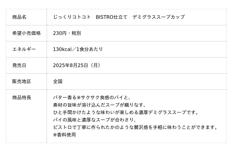 当社の調査によると、カップ入りスープに対して「食べごたえ」の他に「作るには手間のかかる本格料理を手軽に味わいたい」というニーズもあることが分かりました。その要望にお応えすべく、当社オリジナル具材のパイを使用した「じっくりコトコト BISTRO仕立て デミグラススープ」を新発売します。