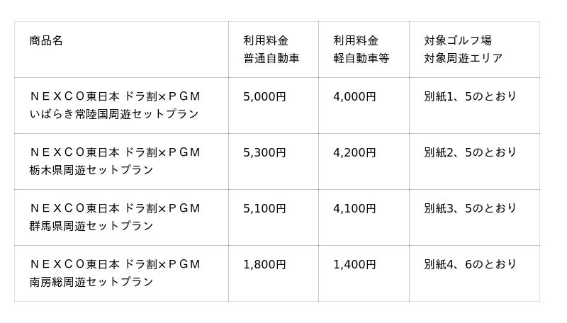 パシフィックゴルフマネージメント株式会社(本社:東京都台東区東上野/代表取締役社長 田中 耕太郎、以下「PGM」)と、東日本高速道路株式会社(関東支社:埼玉県さいたま市、以下「NEXCO東日本」)は、8月19日より「NEXCO東日本 ドラ割×PGM」いばらき常陸国周遊セットプラン、栃木県周遊セットプラン、群馬県周遊セットプラン及び南房総周遊セットプランを(以下「本プラン」)を発売いたします。