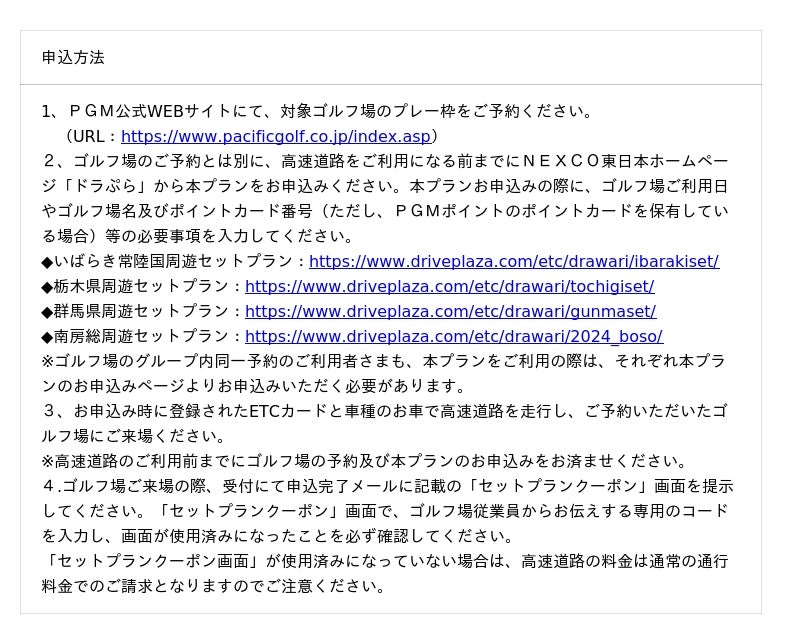ご利用の際は、事前のゴルフ場予約及び本プランのお申込みが必要となり、ゴルフのプレー料金と高速道路の通行料金のお支払いは別となりますので、ご注意ください。プレー料金についてはPGMの公式WEBサイトをご確認ください。