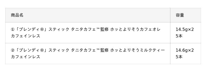 味の素AGF株式会社(代表取締役社長:島本 憲仁 以下、味の素AGF)は、株式会社タニタ(代表取締役社長:谷田 千里、所在地:東京都板橋区 以下、タニタ)と協業し、《「ブレン ディ(R)」スティック》シリーズから、タニタカフェ監修の<ホッとよりそうカフェオレ カフェインレス><ホッとよりそうミルクティー カフェインレス>を、2025年8月19日(火)より順次、通信販売ならびにタニタ食堂、タニタカフェの一部店舗で新発売します。