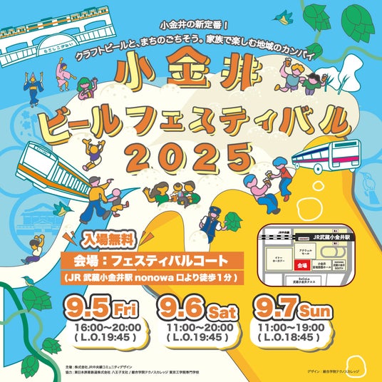 中央線ビアワークスは、2025年9月5日(金)~7日(日)に JR武蔵小金井駅近くのフェスティバルコートで開催する「小金井ビールフェスティバル2025」(当社主催)に出店します。多摩地域のクラフトビールを提供する13のビール事業者と、小金井市内4つの飲食店舗が出店し、沿線地域の魅力を味わえるイベントです。中央線ビアワークスの初の自社醸造ビールも販売予定ですので、ぜひご来場ください!