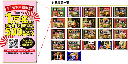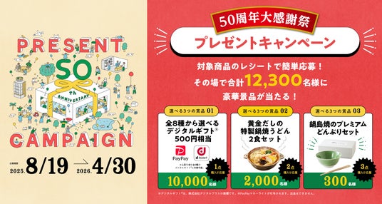 50周年にあたり、消費者の皆さまへ感謝の気持ちを込め、対象商品を購入するともらえるポイントを貯めて応募すると、選べるデジタルギフト(500円相当)や特製鍋焼うどん、オリジナルグッズが総勢12,300名様に当たるキャンペーン「50周年大感謝祭」を開催いたします。