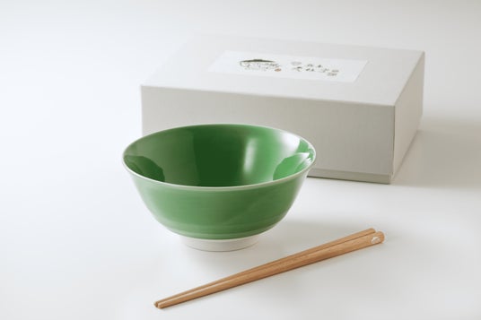 江戸時代に将軍や大名だけが使うことができた陶磁器・鍋島焼。鍋島焼虎仙窯さんに、50周年記念の丼を特別に制作していただきました。翡翠のような美しさで気品のある佇まいが持ち味です。うどん箸とともに限定化粧箱にいれてお届けいたします。