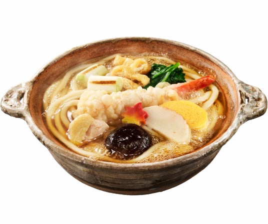 50年の歴史と技術が詰まった特別な鍋焼うどん。自社で削りたての節からとった風味豊かな自家製の黄金だし、三重県産「あやひかり」の一等粉を100%使用した麺、海老天や自社煮込みの阿波尾鶏・椎茸など9種の具材が楽しめる贅沢な一杯。