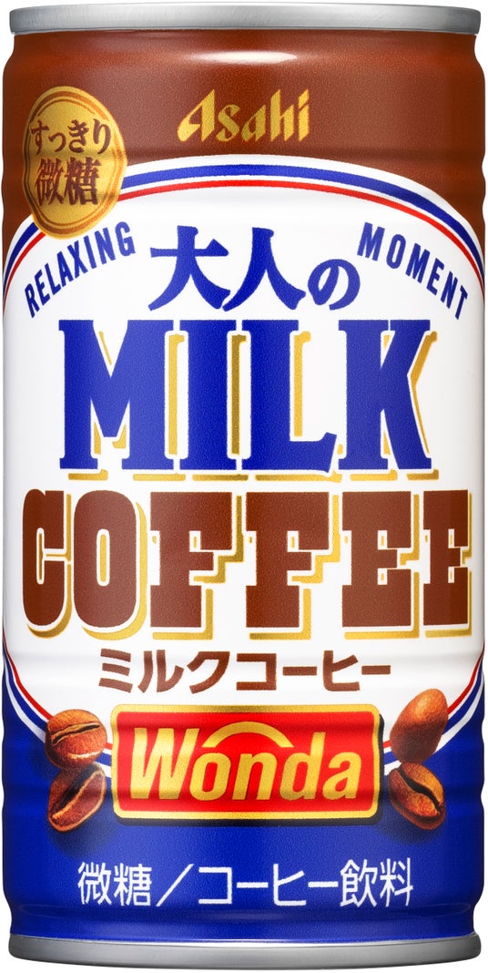 『ワンダ 大人のミルクコーヒー』は、微糖で甘さ控えめの缶コーヒーです。エスプレッソ仕立ての香ばしいコーヒーとこだわりのミルク感をすっきりした微糖の味わいで楽しめます。ターゲットである30~50代の男性は、初めてのコーヒー体験では甘さのある「ミルクコーヒー」を選ぶ人が多い反面、大人になるとその味を「甘すぎる」と感じる人もいることに着目し、甘さ控えめに仕上げたことから「大人のミルクコーヒー」としました。学生時代に飲んだ「ミルクコーヒー」を思い出させるような、平成初期をイメージした懐かしさのあるデザインとしています。缶の裏面には12種類の「平成あるあるコラム」をランダムに掲載し、お客さまが「懐かしい」を感じ気分転換となる機会を創出します。