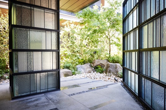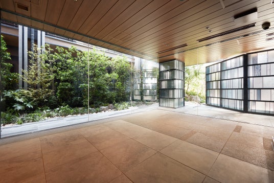 地上3階建ての低層マンションである本物件は、「等々力渓谷に佇む邸宅」をイメージし、等々力渓谷の神秘性や四季の彩りをテーマに、建物のフォルムや素材、色調などを計画。敷地内の植栽スペースは広めに確保しており、エントランスホールからは緑鮮やかな庭園風景を楽しめます。