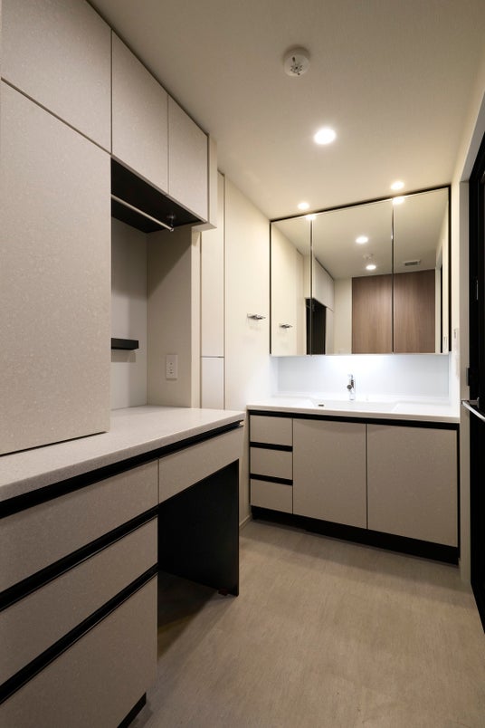本物件では、理想の洗面室を目指して企画・開発した『MOTリネン』を初めて導入しました。洗面室内に設けた大容量収納は、洗濯・乾燥後の衣類をその場で畳んで収納することができ、家事の時短につながります。さらに、作業台やドレッサーとしても使えるカウンターをはじめ、洋服の一時掛けができるハンガーパイプなど、多機能スペースを備え、住む人のライフスタイルに合わせてフレキシブルな使い方ができる空間になっています。また、暮らしの中の水にこだわり、微弱な気泡で白濁の湯を楽しむことができる給湯システム「マイクロバブルバスユニット」や暮らしの水をクリーンにする浄水システム「良水工房」を全戸に導入しました。