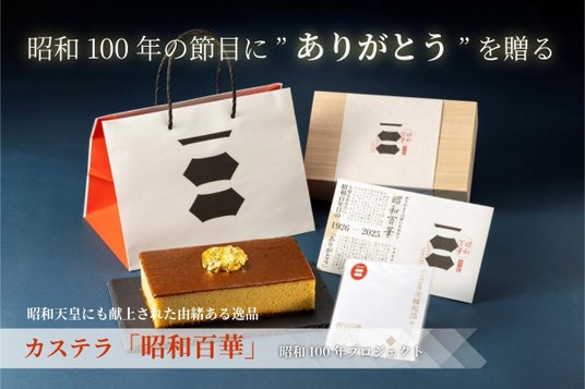 有限会社齋藤アルケン工業(島根県浜田市)は、老舗和菓子店と手焼き製法で仕上げた金箔付き桐箱入りカステラ『昭和百華』をECサイトで全国へ向け販売開始します。昭和元年生まれで、100歳になる祖母への感謝から生まれた、昭和の味を再現した贈答用の逸品です。