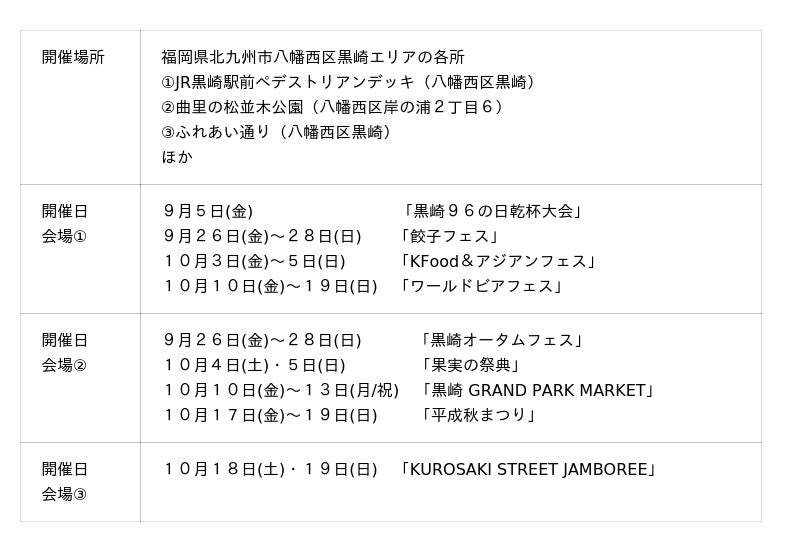 最終週の10月17~19日は、昭和夏まつりチームがお届けする「平成秋まつり」が黒崎にやってくる!黒崎のまちの中心で、世代を超えてみんなで歌って踊って大盛り上がり!