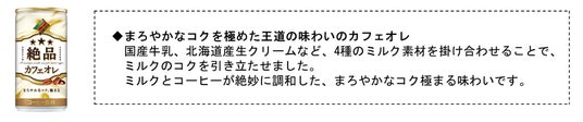 「ダイドーブレンド 絶品カフェオレ」は、国産牛乳、北海道産生クリームなど、4種のミルク素材を掛け合わせることでミルクのコクを引き立たせ、ミルクとコーヒーが絶妙に調和した、まろやかなコク極まる味わいに仕上げました。