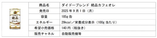 ダイドードリンコ株式会社(本社:大阪市北区、代表取締役社長:中島 孝徳)は、2025年秋冬の新商品として、「ダイドーブレンド 絶品カフェオレ」を9月1日(月)より発売いたします。