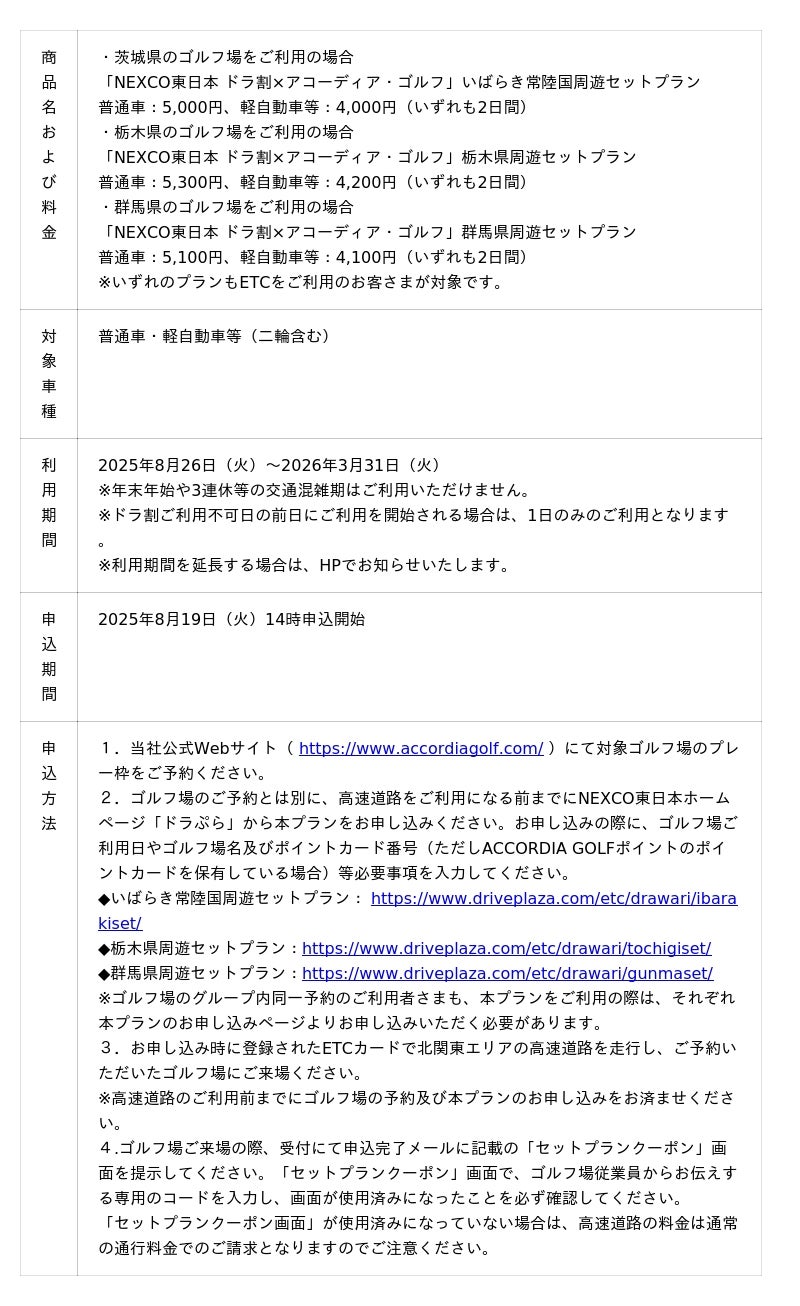 株式会社アコーディア・ゴルフ(本社:東京都台東区、代表取締役社長:三好 康之、以下「当社」)とNEXCO東日本関東支社(埼玉県さいたま市)は、8月19日より「NEXCO東日本 ドラ割×アコーディア・ゴルフ」北関東3県周遊セットプラン(以下「本プラン」)を発売しますのでお知らせいたします。
