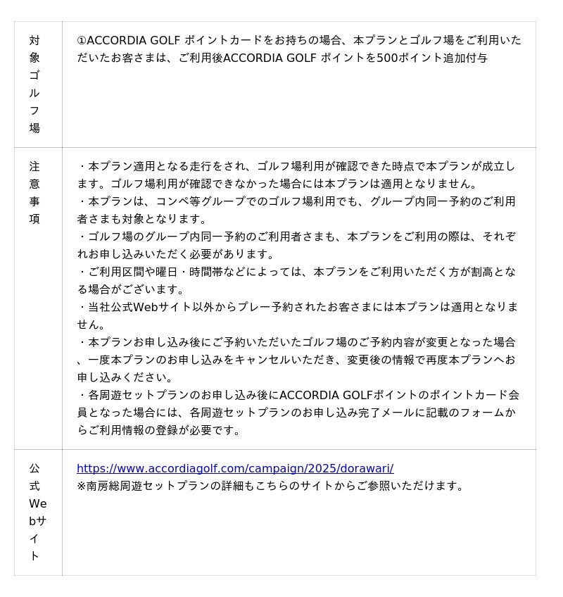 本プランは、北関東3県(茨城県、栃木県、群馬県)にある当社のゴルフ場(対象30カ所)をご利用されるお客さま向けに発売する高速道路割引商品です。ゴルフプレーと高速道路利用とをセットでご利用いただく際、大変お得な料金で高速道路を利用でき、さらに決められた範囲内なら自由に乗り降りできるパスへお申し込みいただけるプランとなっています。また、ACCORDIA GOLF ポイントカードをお持ちのお客さまが本プランでゴルフ場をご利用いただいた場合、ご利用後にACCORDIA GOLF ポイントが500ポイントを追加付与いたします。