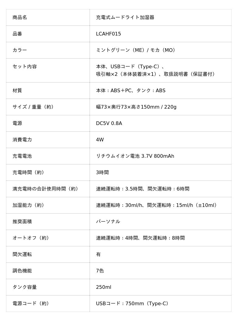 「充電式ムードライト加湿器」LCAHF015