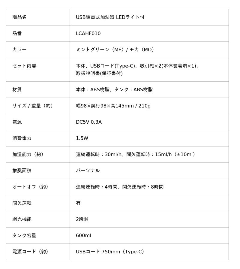 「USB給電式加湿器 LEDライト付」LCAHF010