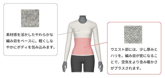 ベースは素材感を活かしたやわらかな編み目にし、ウエスト部には厚みとハリをもたせた編み目にしています。二種類の編み目をパーツごとに変化させることで、冷えやすいおなか周りを温めます。