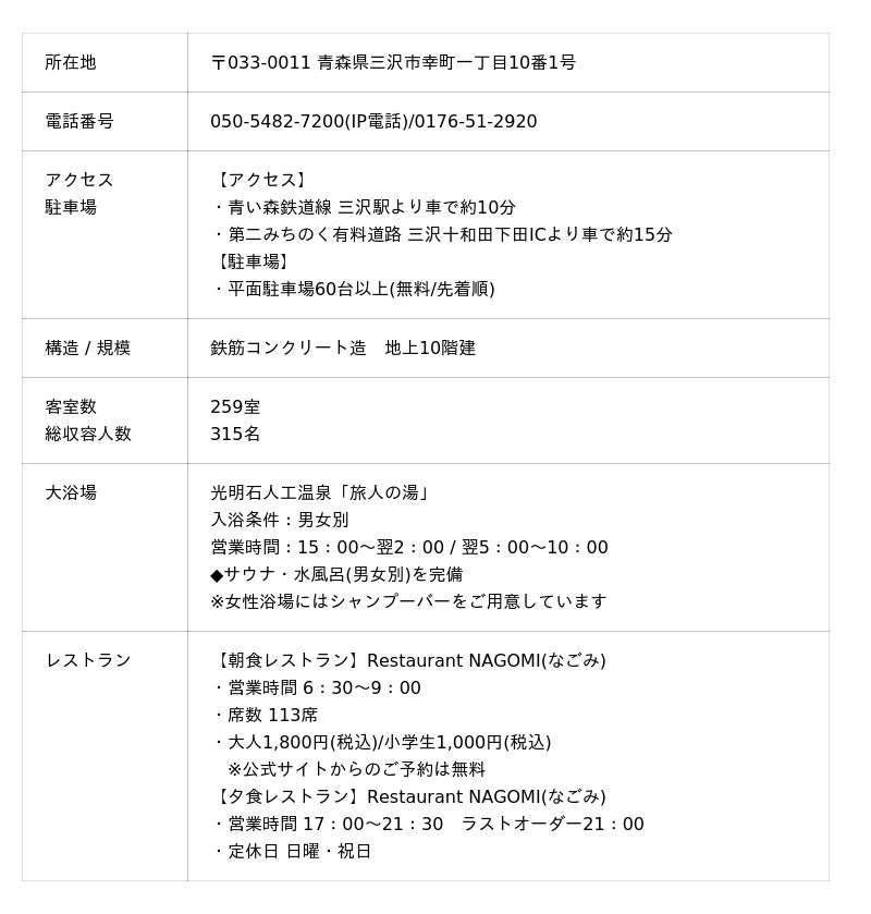 青い森鉄道線 三沢駅から車で約10分、第二みちのく有料道路 三沢十和田下田ICから車で約15分に位置し三沢空港へのアクセスも良好です。自慢のバイキング朝食や光明石人工温泉・サウナを備え、客室では長期滞在向けのミニキッチンが付いたレジデンシャルシングルルームをご用意。ビジネスや観光など幅広い目的でご利用いただけます。