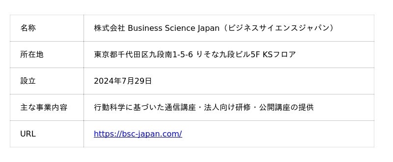 株式会社 Business Science Japan(ビジネスサイエンスジャパン)は、「人の可能性を科学で引き出す」という理念のもと、行動心理学や行動経済学など科学的根拠に基づいた教育・研修を提供しています。個人や組織が激動する社会の中で成果を上げ続けられるよう、"再現性"のある知識とスキルの体系化に力を入れています。