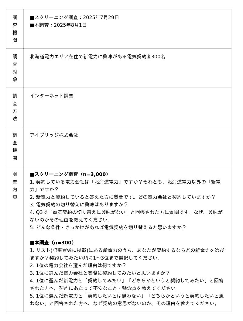 北海道電力エリアの電力会社選びで迷いがある方の、判断材料のひとつとして本調査レポートを活用いただけますと幸いです。
