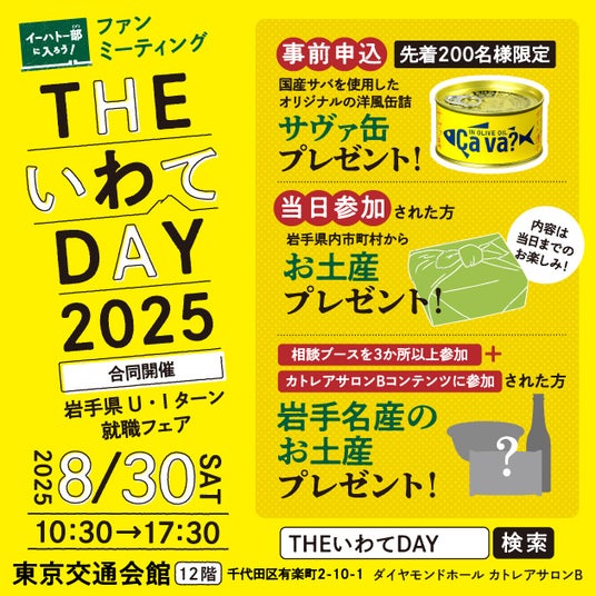 岩手県は、U・Iターンの促進を目的とし、8月30日(土)に東京有楽町・東京交通会館で岩手県主催移住フェア「THEいわてDAY 2025」を実施します。
