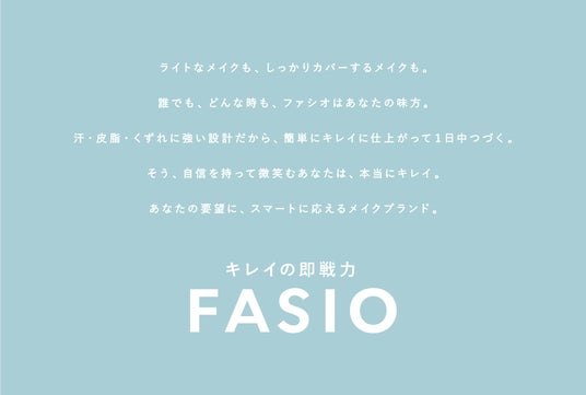 ライトなメイクも、しっかりカバーするメイクも。誰でも、どんな時も、『ファシオ』はあなたの味方。汗・皮脂・くずれに強い設計だから、簡単にキレイに仕上がって1日中つづく。そう、自信を持って微笑むあなたは、本当にキレイ。あなたの要望に、スマートに応えるメイクブランド。キレイの即戦力『ファシオ』