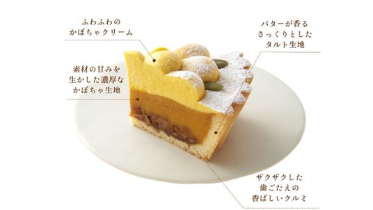 タルト台は、バターが香るさくさくのサブレ生地。素材の甘さを生かした濃厚なかぼちゃ生地を、高さのあるタルト台にたっぷりと流し込んで焼き上げ、ふわふわの軽やかなかぼちゃクリームを花形にデコレーション。