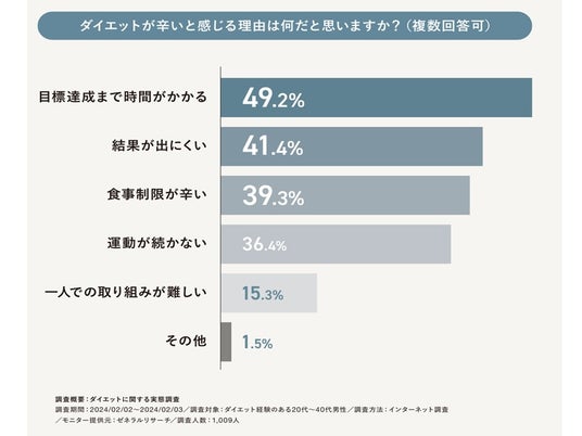 ダイエット経験者の約半数が「継続の難しさ」に悩んでいるという調査結果があります。具体的には、「目標達成まで時間がかかる」(49.2%)、「結果が出にくい」(41.4%)、「食事制限が辛い」(39.3%)といった理由で多くの人が挫折を経験しています。