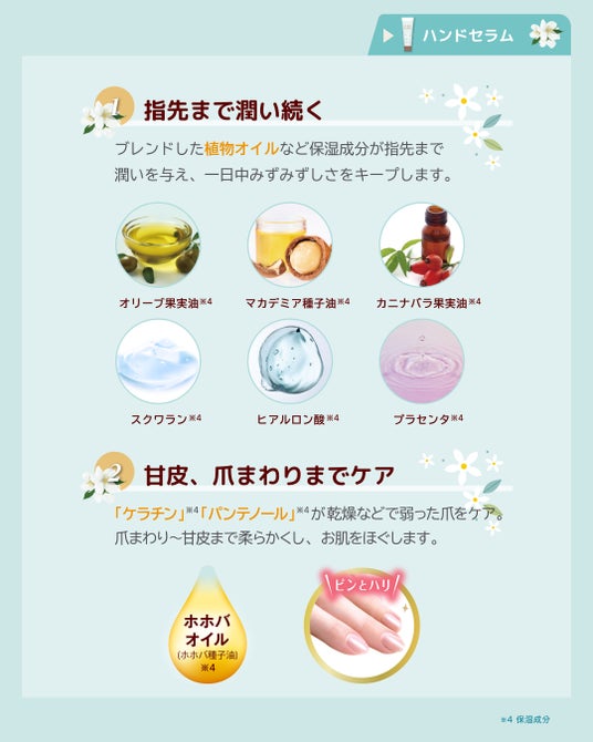 5種の植物オイル※6とヒアルロン酸、プラセンタエキスなど保湿成分が指先まで潤いを与え、一日中みずみずしさをキープします。