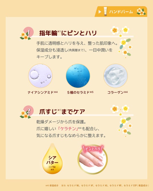 ナイアシンアミド、セラミド、コラーゲンが手肌にハリを与え、一日中潤いをキープします。