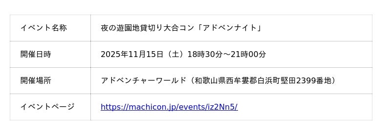株式会社リンクバル(本社:東京都中央区、代表取締役社長:吉弘和正、証券コード:6046、以下「リンクバル」)が運営するイベントECサイト「machicon JAPAN」は、2025年11月25日に和歌山県の「アドベンチャーワールド」にて開催される【夜の遊園地貸切り大合コン(アドベンナイト)、以下「本イベント」】の掲載を開始いたしました。