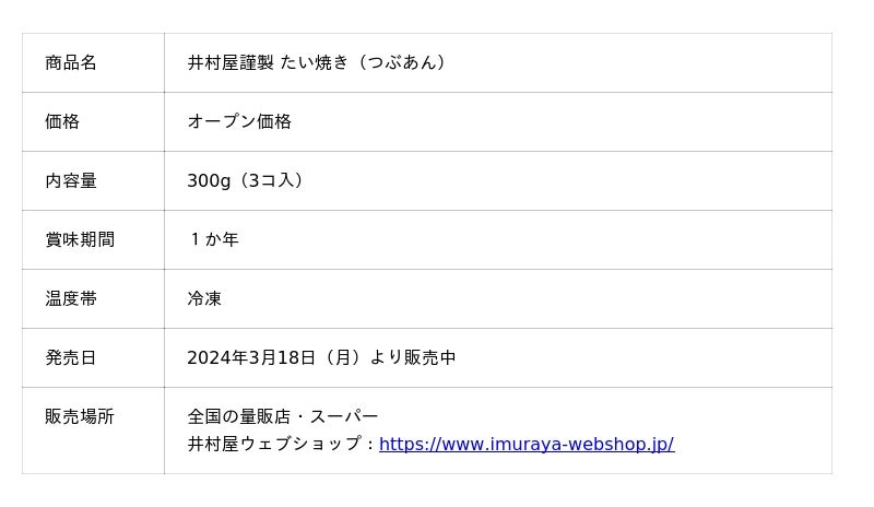 このたび2024年2月より稼働したたい焼きラインを活用し、こだわりの"あん"を活かした「井村屋謹製たい焼き」シリーズ第2弾として『井村屋謹製 たい焼き(白つぶあん)』を発売します。