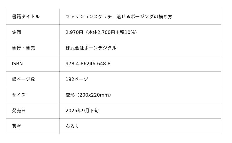 株式会社ボーンデジタル(本社:東京都千代田区、CEO:新 和也、URL:https://www.borndigital.co.jp)は、『ファッションスケッチ 魅せるポージングの描き方』(著:ふるり)を2025年9月下旬に発売いたします。