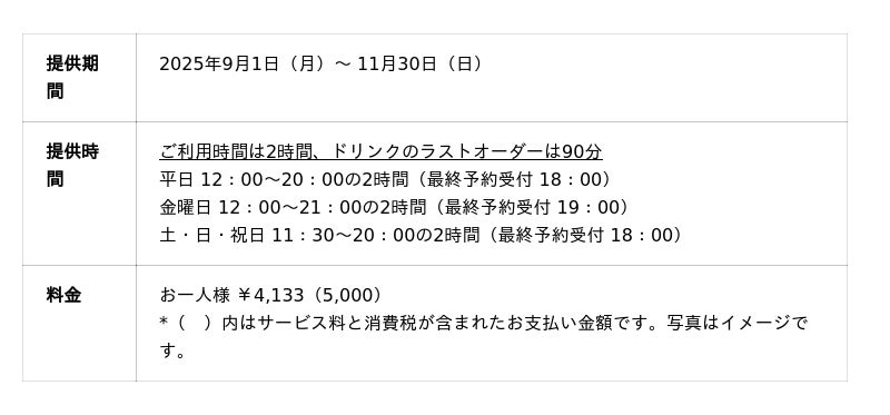*食材の仕入れ状況によりメニュー内容、提供方法・時間などを変更する場合がございます。