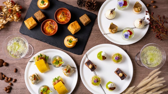 シャインマスカットとエルダーフラワーゼリーにソーダを注ぐアミューズにはじまり、口いっぱいに甘みが広がるシャインマスカットをのせたタルトや、国産洋梨のコンポートとチョコレートクリームをサンドしたしっとり濃厚なガトーショコラなど、華やかなスイーツをご用意。また、スモークサーモンとカボチャのトルティーヤやさつまいもと舞茸のプティブレッド、紅茶といちじくのスコーンなど秋の味覚が集結する旬の味わいをお楽しみいただけます。
